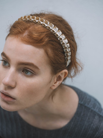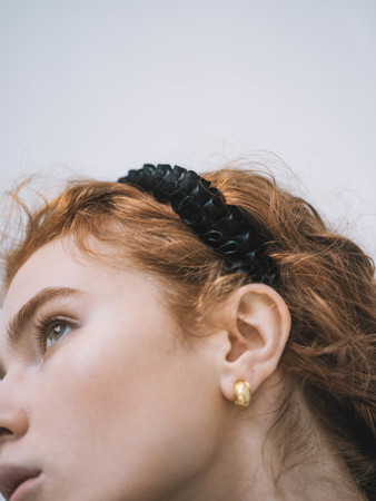 ベロア素材のリボンが波打つヘッドバンドは、マジックショーがおこなわれる部屋のカーテンがイメージ。 ガーリーな印象とは裏腹に、実際に着用するとクラシカルなムードが漂います。丸みのあるデザインとマットな質感で、表情をやわらかに見せてくれる効果も。