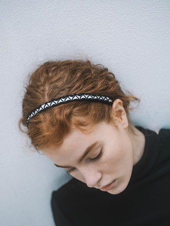 目の詰った糸を使ったレースのヘッドバンド。レースならではのロマンティックな雰囲気とハリのある素材とのバランスで、顔周りを優しく引き締めます。細身ながら主張のあるヘッドバンドなので、アクセサリーはあえてつけずに、レースを風合いを楽しむのも素敵。厚手のニットやTシャツと合わせて。