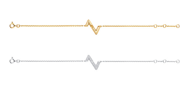 イエローゴールド、そして煌めくダイヤモンドを配したホワイトゴールドのペンダントを生き生きと彩るのは、上向きと下向きに組み合わされた2つのイニシャル。そのシャープなラインは、ブレスレットのエネルギッシュな輝きを一層高めます。