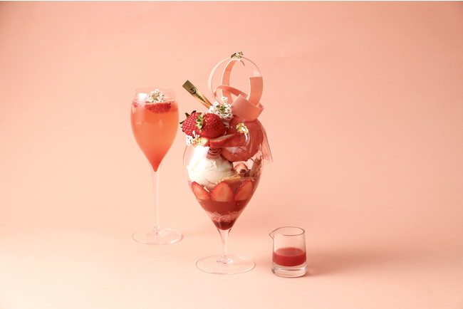 まるでパフェの中でいちご狩りを楽しんでいるかのような、苺づくしの一品です。たっぷりの苺にサクサクのパイ生地を合わせました。主役の苺は「いばらキッス」を使用。特製イチゴシロップにライムとローズマリーの香りが楽しめる、まるでお花畑のような香りの微炭酸オリジナルノンアルカクテルとのペアリングをお楽しみください。