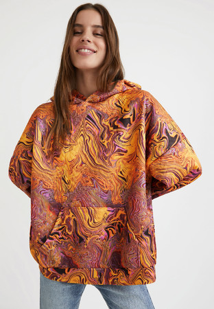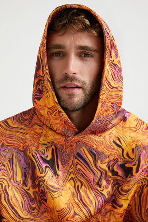 ARやメタバースなどのデバイスを介した仮想世界から着想を得たという彼女の作品には、2Dと3Dの両方のデザインソフトウェアを活用したマーブル模様のデジタルプリントがあしらわれています。また、素材にはリサイクルポリエステルを使用し、サステナブルなユニセックスウェアとなっております。