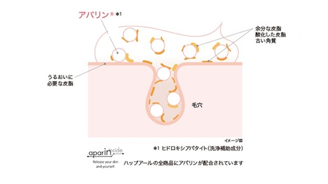 「ハップアール」は、サンギのコア技術である身体への親和性の高い成分「ハイドロキシアパタイト」の持つ吸着性能を活かした肌専用アパタイト「アパリン」※2を配合したスキンケアブランドです。洗浄補助成分としての高い機能を持つアパリンは、肌のダメージを引き起こすとされる3つの要因(1.余分な皮脂、2.酸化した皮脂、3.古い角質)を選択的に吸着し、除去します。肌本来の保湿に必要な皮脂を残してくれるので、美しい素肌作りをサポートします。