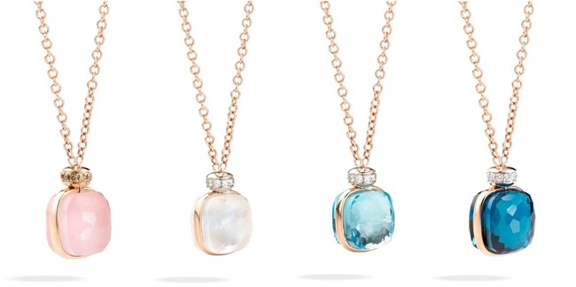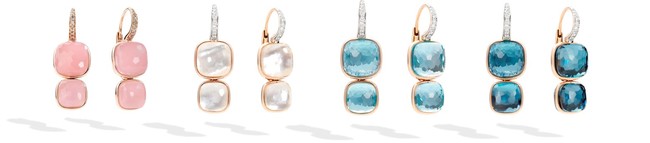 マストハブコレクションとも言えるポメラートの「ヌード」に、初めての登場となるダブルドロップのイヤリングと、魅惑的なペンダントが誕生しました。メゾン独自のクレシドラカットがほどこされたホワイトトパーズ、ブルートパーズ、ローズクォーツをセッティングしています。