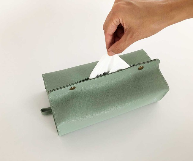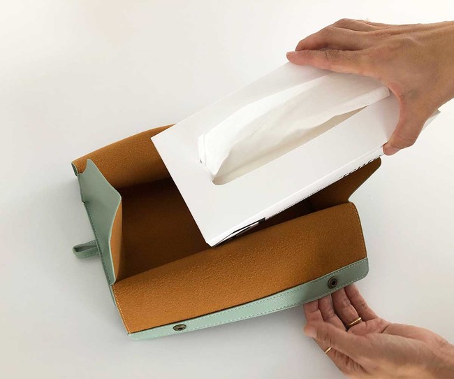ボタンを開けて、中にボックスティシューを収納。(デザインによりマジックテープのものもございます)