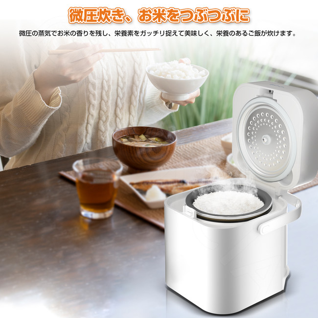 一人暮らし用小型マイコン式炊飯器、1~3人分のご飯が炊けます。釜は金属製のため、熱伝導率が高く、バランス良く加熱ができます。また、低圧炊飯のため、お米の香りをそのまま残し、一粒一粒がふっくらとし、美味しいごはんが炊きあがります。