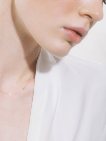 素肌に馴染む繊細なチェーンと、1/60カラットの小粒なダイヤモンドとのバランスで、日常使いしやすいネックレス。ダイヤモンドの周りを地金で丸く囲い、サイドを両づり仕様にすることで、肌に吸い付くような着用感を実現。