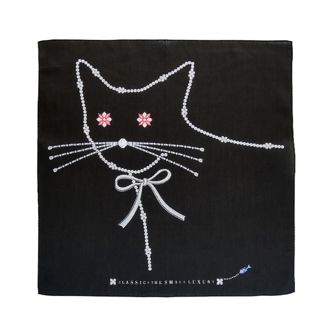 猫loverのあなたへ。猫を愛してやまないあの方へ。バッグやポケットに忍ばせて、ちょっぴり気分が上がったり、心なごむ一枚を。新作は、きらめくジュエリーで描いた黒猫が主役のハンカチーフです。この他、猫をモチーフにした様々なデザインのハンカチーフも展開します。