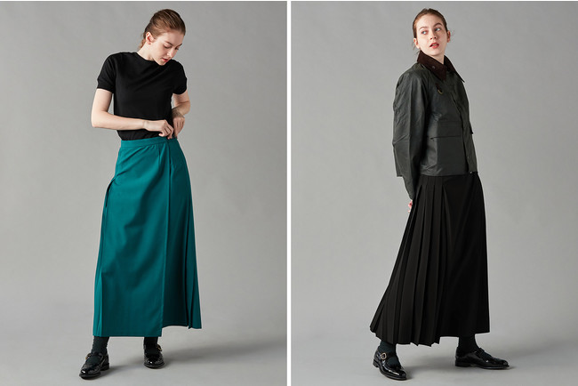落ち感が美しく出るファブリックと、表情が出やすい折り幅を採用しており、歩いたときのプリーツの動きがとてもエレガントです。