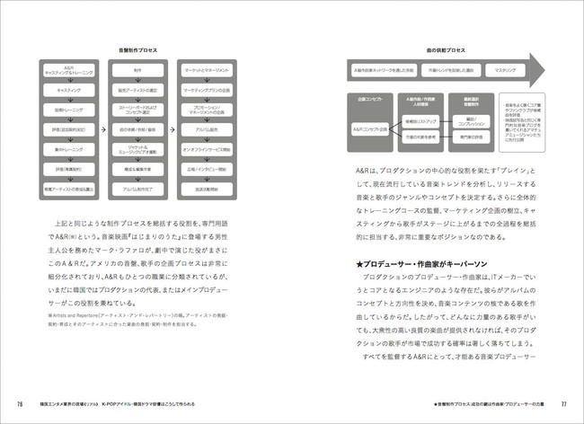 オーディションからトレーニング、専属契約までの流れとシステム、デビューからミュージックビデオ製作にかける費用まで、3大芸能事務所の楽曲制作の方法、プロデュースとマーケティング手法などを具体的な数字で収録。