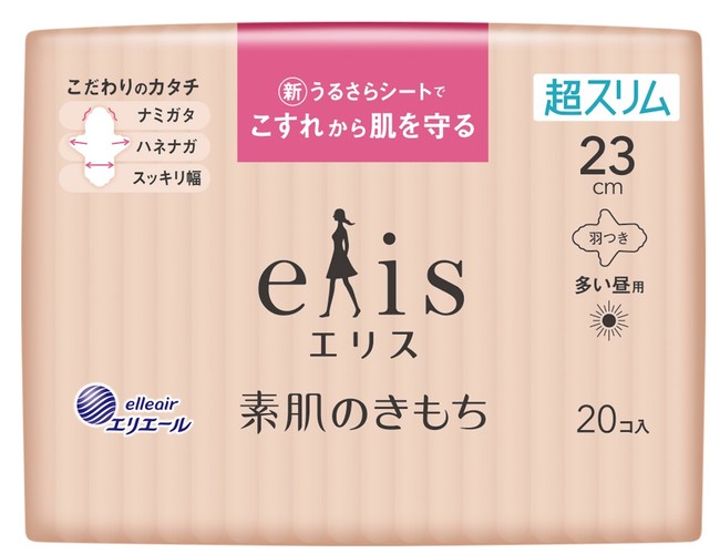 「エリス 新・素肌感」は、女性の生理による肌トラブルを軽減することを目指して2003年に生まれました。「からだのまるみにそってやさしくフィット!モレ安心!」なベーシックシリーズです。