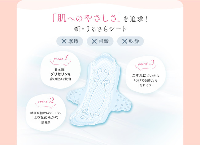 今回、「新 うるさらシートでこすれから肌を守る」をコンセプトに、日本初※1のうるさらシート採用、ギャザーの改良、こだわりのカタチで、さらに肌にやさしくリニューアルします。
