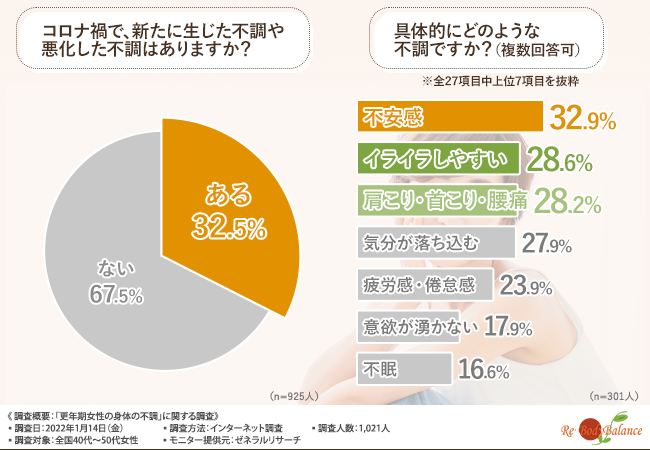 そこで、「ある」と回答した方に「具体的にどのような不調ですか?(複数回答可)」と質問したところ、『不安感(32.9%)』と回答した方が最も多く、次いで『イライラしやすい(28.6%)』『肩こり・首こり・腰痛(28.2%)』『気分が落ち込む(27.9%)』『疲労感・倦怠感(23.9%)』『意欲が湧かない(17.9%)』『不眠(16.6%)』と続きました。