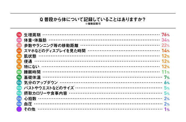 健康のためには日頃から体のコンディションを把握しておくことも必要です。そこで、普段から自分の体について計測・記録している指標について調べると、76%の方が「生理周期」を記録していました。これは「体重・体脂肪」や「歩数やランニング等の移動距離」など他の指標に比べて非常に高い割合でした。