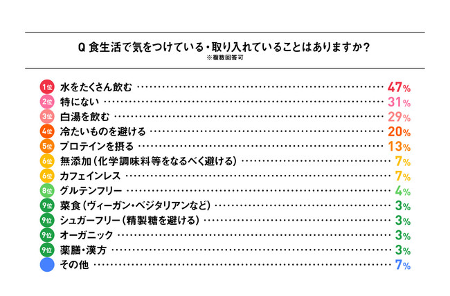 最後に、ヘルスケアに関する情報元として、もっとも参考にしているものは何かたずねました。結果は「特にない(20%)」と回答した方がもっとも多かったものの、「ネット上の口コミ(19%)」「テレビ(13%)」「一般人のブログやSNS(11%)」という結果となりました。