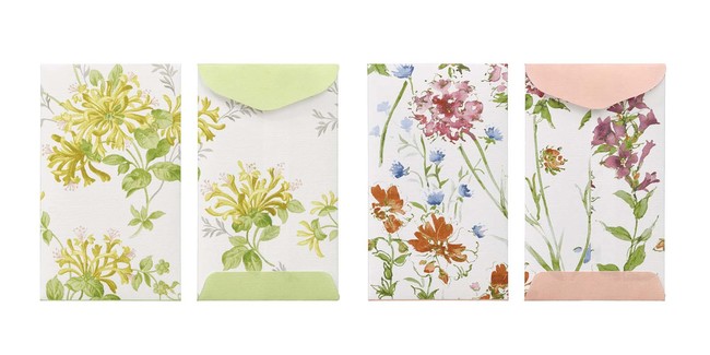 今回、黄色い花が特徴的で爽やかな雰囲気の「ハニーサックル」、英国の野草が鮮やかに描かれる「ワイルドメドウ」、の2柄を採用した『レターセット』と『ぽち袋』を新たに発売します。