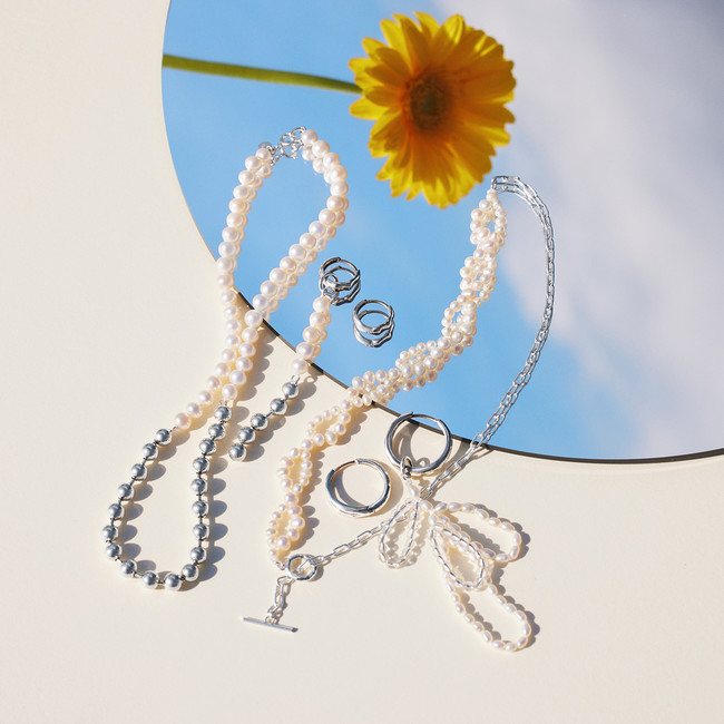 シルバーにパールを組み合わせ、切り返しの遊び心を添えたシリーズ。 繊細に編んだパールとシルバーチェーンのコンビネーションネックレスや、 パールとシルバーボールチェーンを潔く1本に仕立てたアイテムなど。 存在感がありながら、春の装いにマッチする軽やかな仕上がり。
