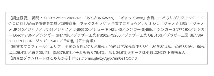 園児とママの情報誌「あんふぁん」「ぎゅって」を発行する株式会社こどもりびんぐ(所在地:東京都千代田区、代表取締役:中島一弘)は、「シルミル研究所」としてリサーチ事業を展開しています。「シルミル研究所」では、全国の女性を対象にした調査「ウーマンリサーチ」を実施し、女性が選ぶおすすめの商品やサービスをランキング形式で、Webコンテンツとして発信しています。今回は2021年12月~2022年1月に実施した「ミシンに関する調査」の結果を発表いたします。