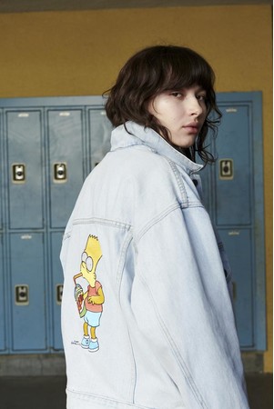 コレクションには、ショーのオープニングに欠かせないであろう、片面に雲が浮かぶスカイブルーのプリント、もう片面にはシンプソンズイエローをあしらったリバーシブルのパファーベストや、Bart Simpson(バート・シンプソン)がSquishee(スクイシー:作中に登場する天然成分も水さえも含まない不健康で怪しげなドリンク!)を飲んでいるグラフィックとアイコニックなLevi’s(R)のバットウィングロゴを配したルーズシルエットのトラッカージャケットがラインナップ。また、スプリングフィールド小学校にちなんだリンガーTシャツやレターマンスウェット、ヴィンテージの制服にインスパイアされたイエローのコーデュロイジャケットとパンツなど、スクールスタイルも揃います。ジャケットの裏地にはLisa Simpson(リサ・シンプソン), Ralph Wiggum(ラルフ・ウィガム), Mrs. Krabappel(ミセス クラバッペル), Otto the Bus driver(バスドライバーのオットー)など、The Simpsonsの人気キャラクターが総柄で登場するのにも注目です。そして、The Simpsonsのキャラクターのプリントを施したフーデッドパファージャケットや、コットンツイルのバゲットハットも揃います。コレクションの最後には、The Simpsonsの象徴的なエピソードのシーンを投影したグラフィックTシャツ、フーディ、クルーネックスェットシャツ、そして刺繍入りのビーニーや、空にモコモコの雲が浮かぶスリングバッグといったアクセサリーも充実します。