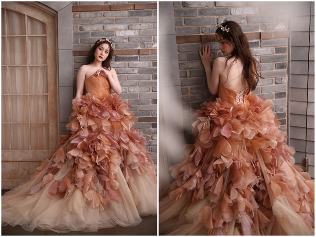 トレンドを押さえた絶妙なブラウンカラーと、ちょっと個性的なスカートラインがまさに「唯一無二」のカラードレスです。