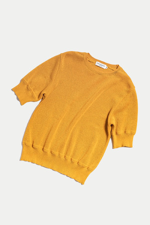春夏の定番アイテムになりつつあるニットTシャツ。イギリスの漁師をはじめ、アーティストからも愛用されていた作業着「フィッシャーマンスモック」を現代風にアレンジしたデザインが特徴です。襟ぐりの両肩部分には、湾曲する襟のラインを美しく見せるために付けられていたという「三角マチ」を同色糸の編み柄で表現するなど、伝統的なディテールを取り入れながら、袖口をパフ・スリーブにし、裾を長めのリブ仕様に設計することで女性らしいシルエットに仕上がっています。少しゆとりのある身幅に対して、着丈が短くすっきりしているため、ボリューム感のあるフレアスカートやワイドパンツなど、トレンドアイテムとの相性も抜群です。