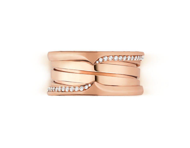 なめらかで彫刻的、そして紛れもなく建築的なデザインがローマの壮大なコロセウムを想起させる「ビー・ゼロワン」リングは、アイコンの中央に配されたスパイラルを挟むように、両エッジにあしらわれたパヴェダイヤモンドが流麗なウェーブを描き、細部にまでこだわった意匠が際立ちます。イエロー、ピンク、ホワイトゴールド製の3連リングを取り揃え、従来のジュエリー常識を覆した伝説的なデザインと、新しいインスピレーションを感じさせる革新性が混然一体となっています。