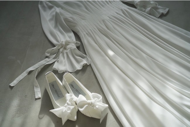 地球を愛する花嫁たちに“ウェディングもサステナブルに!”という願いを叶える、オッフェンのウェディングパンプス。アッパーの付属デザインは、ウェディングドレスを作る過程で余った残布を使用し素敵なデザインへ、ウェディングドレスのアトリエにて1つ1つ丁寧に作られています。 普段にも履ける“私らしい”ウェディングスタイルを提案する一足が誕生しました。
