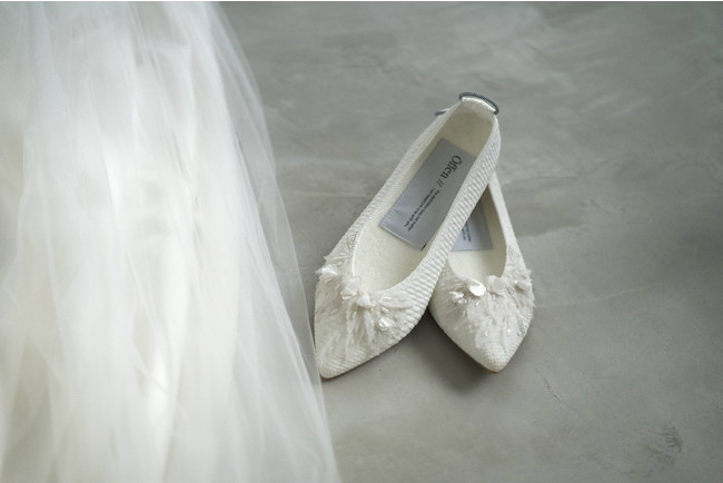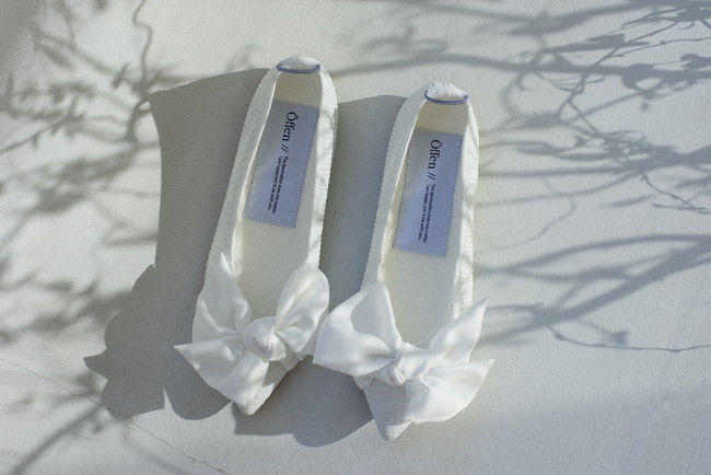 一度きりの「特別な靴」から、その後も「私と共にある」普段履きも可能な、“新しい等身大のウェディングシューズ”。鎌倉のウェディングドレス専門店「Nuance(ニュアンス)」とのエシカルな取り組みです。「Öffen(オッフェン)」の女性の足を美しく見せる「ポインテッドトゥ」型、最もシンプルで飽きのこないデザイン「O21SPO-0001/plain rectangular pattern WHITE」をベースに、Nuance(ニュアンス)にてウェディングドレスを作る過程で余った残布を使用し、デザイナー大塚由理氏が花嫁様に向けたデザインを施しました。