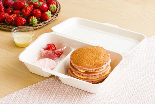 旬のイチゴを楽しめる『ストロベリーと練乳のパンケーキ』は、なめらかなカスタードをイチゴ風味のパンケーキに挟み、甘酸っぱいストロベリーレアチーズクリームとイチゴを盛り付けました。