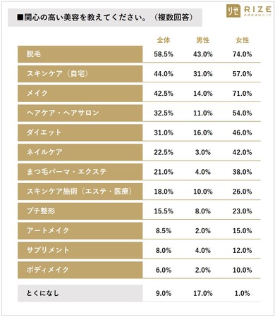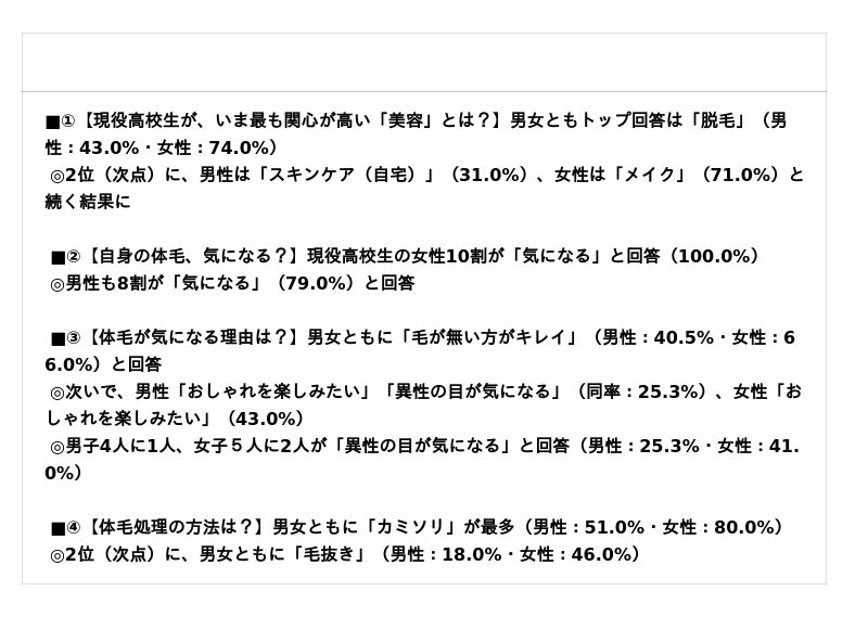 ■【現役高校生が、いま最も関心が高い「美容」とは?】男女ともトップ回答は「脱毛」(男性:43.0%・女性:74.0%)