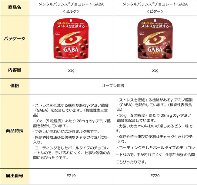 また、「メンタルバランス(R)チョコレート GABA」では、喫 食シーンをより明確にお伝えするため、パッケージコピーを 「事務的な作業による一時的・心理的なストレスを低減する」 から、「仕事や勉強等による一時的・心理的なストレスを低減 する」に変更するリニューアルを行います。「メンタルバラン ス(R)チョコレート GABA」は仕事や勉強等による一時的・心 理的なストレスを低減する機能が報告されているγ―アミノ 酪酸(GABA)を、10g(5粒程度)あたり28mg配合して います。手が汚れにくいコーティングタイプのボールチョコ レートで、チャック付きのスタンドパウチ入りなので、仕事 や勉強のお供に最適です。