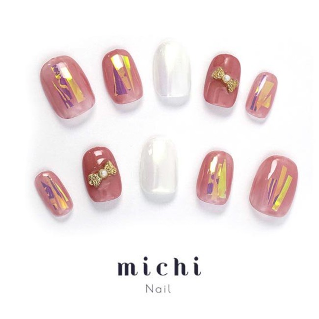 透け感のあるピンクとホワイトのネイルです。ランダムに乗せられたオーロラフィルムとゴールドのリボンがキュートです。この時期のデートにぴったりのネイルです。