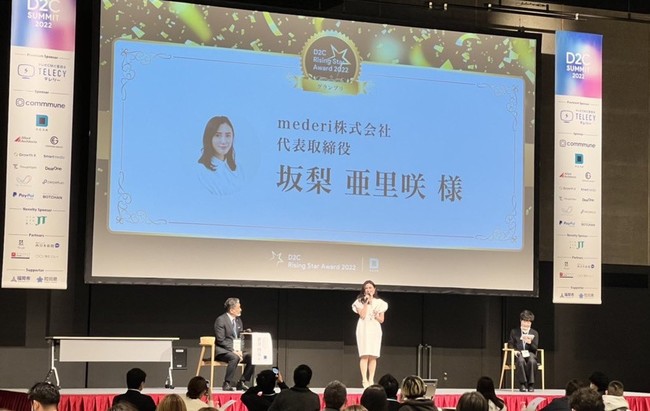 mederiは、D2C事業で新たなことに挑戦し飛躍的に活躍している企業として、厳正なる審査の結果、スタートアップ部門賞に選ばれました。また、各部門の受賞企業の中から、グランプリを受賞いたしました。