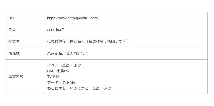 株式会社ブレークポイントは、CM・PV企画制作、番組企画・制作、タレントキャスティング、百貨店イベント企画制作、「ねこにすと」「いぬにすと」の企画・制作・運営などを行うエンターテイメント創造企業です。