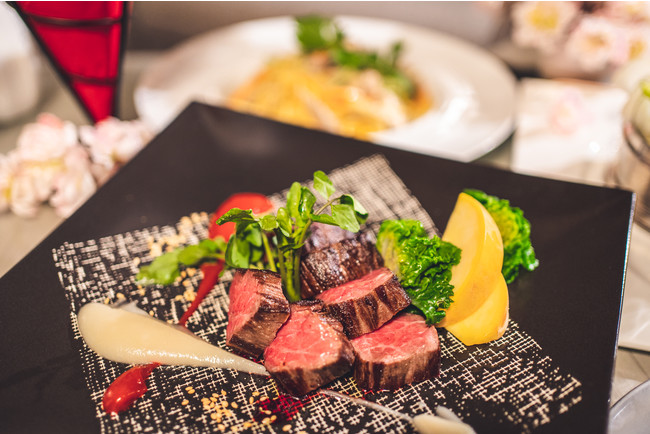 (写真左)佐賀牛のポワレ 梅と新玉葱のソース