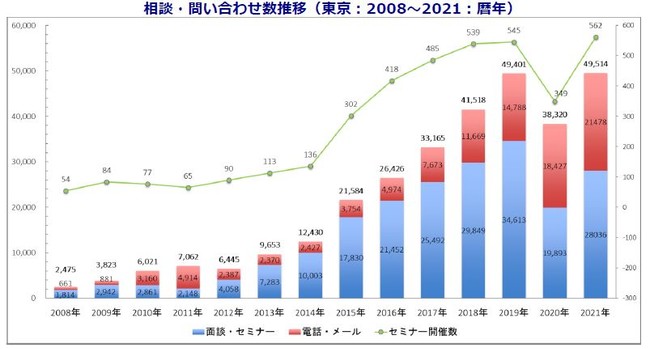 これは、これまでの過去最高の件数を数えた2019年(49,401件)を上回り、過去最高の相談件数を更新した。2021年は依然として新型コロナ禍にも関わらず、新型コロナの影響をもろに受けた2020年の相談件数(38,320件・前年比22%減)の落ち込みからV字回復をした。