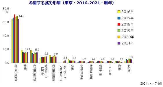 移住相談の傾向としては、まずは、相談者の性別を見ると、2014年以降、着実に女性の割合が増えていることがわかり、2021年は、過去最高の45.4%であった。次に、相談者の年代を見ると、20代が2021年は、過去最高の21.9%であった。このことから、地方移住に対する女性、若者の関心が高まっていることがわかる。そして、希望する就労形態を見ていくとテレワークを希望する割合が3.3%で、昨年から1.5%増え、増加傾向であった。