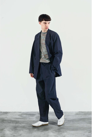 男女共通デザインのジャケットとパンツはセットアップで着用が可能。素材は麻のナチュラルな表情とドライなタッチを加えたリネンウールファブリックを使用しています。ジャケットはピークドラペルの襟が特徴のカジュアルな中にエレガントさもあるデザイン。パンツはドローストリングとサイドバックルが付いたミリタリーテイストのディテールを取り入れています。