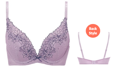 シャープなV字のデコルテラインですっきりとした印象。前中心は低く、サイドは高さがあるので、安定感のある着けごこち。底厚のモールドカップでバストを前中心に集め、きれいな谷間をメイクします。