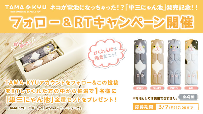 ただいまTAMA-KYU(たまきゅう)公式Twitterにて「単三にゃん池」全種セットが当たるキャンペーンを実施中です。