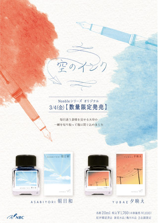 文具卸・店舗運営の株式会社エヌ・ビー・シー(本社東京都目黒区 / 代表取締役社長 丸山裕子、以下エヌ・ビー・シー)のオリジナルブランドNONBLEから、新シリーズとなる数量限定万年筆が登場。空をテーマにした「朝日和」「夕映え」の2種類を3月4日(金)より、紀伊國屋書店新宿本店、梅田本店の文具売り場で発売いたします。また、それぞれの空の色を再現したインクも数量限定で同時発売となりますので、あわせてお知らせいたします。