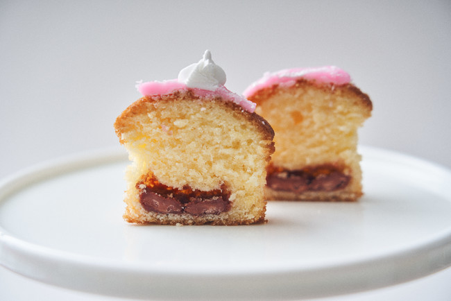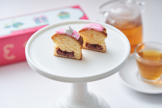 シンプルなアイシングデコレーションには、いちごのフリーズドライや絞ったメレンゲをトッピング。可憐なピンク色が春の彩りを感じさせてくれます。そのままはもちろん、レンジで少し温めるとカップケーキの中に入ったチョコレートがとろりと溶け、また違った味わいも楽しめます。