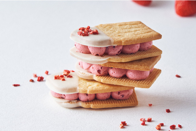 程よい酸味で甘くひときわジューシー。三拍子のバランスが揃う最高品質のいちご〈あすかルビー〉と、つぶつぶ食感がクセになる甘酸っぱいラズベリーをまるごと煮込んだ自家製ジャムに、ホイップしたフレッシュバターを合わせ、果実感たっぷりの瑞々しい特製“ジャム生バタークリーム”が完成しました。ホワイトチョコレートがけした焼きたてのビスケットへ1つ1つ丁寧にクリームを絞ってサンドし、いちごのフリーズドライをトッピング。春めいた爽やかな甘みが広がる、味も見た目も華やかないちごのお菓子です。