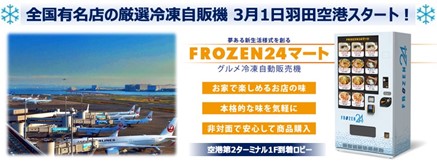 株式会社SOBO(本社:東京都新宿区、代表取締役社長:益川 大平)は、サンデン・リテールシステム株式会社(東京本社:東京都墨田区、代表取締役社長:森 益哉)製造の冷凍自販機「ど冷(ひ)えもん」を活用して、全国有名店の厳選ラインナップを提供する「FROZEN24マート」を、3月1日から東京の空の玄関口である羽田空港第2ターミナル1階到着ロビーに設置し販売をスタートします。