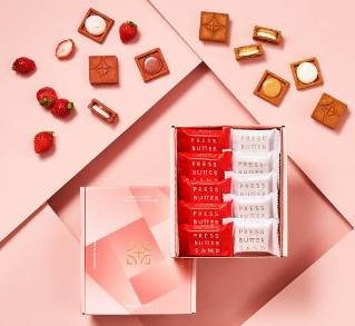 花のつぼみをモチーフにした期間限定ボックスに、福岡県産「あまおう苺」を贅沢に使用したバターサンドと、定番のバターサンドを詰合せたギフト。