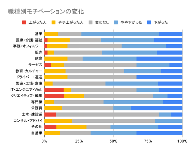 なお、モチベーションと職種の傾向を見るため職種別にモチベーションの変化を比較したところ、