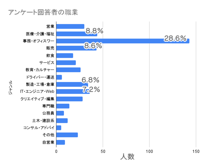 アンケートに回答した500名のうち、事務・オフィスワーカーが28.6%と最も多くなっています。