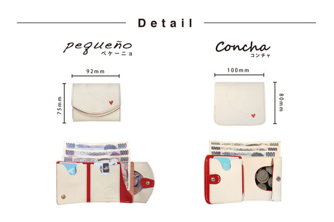 お財布のサイズは二種類。よりコンパクトな「ペケーニョ」とカードがたくさん入る「コンチャ」から選んでいただけます。