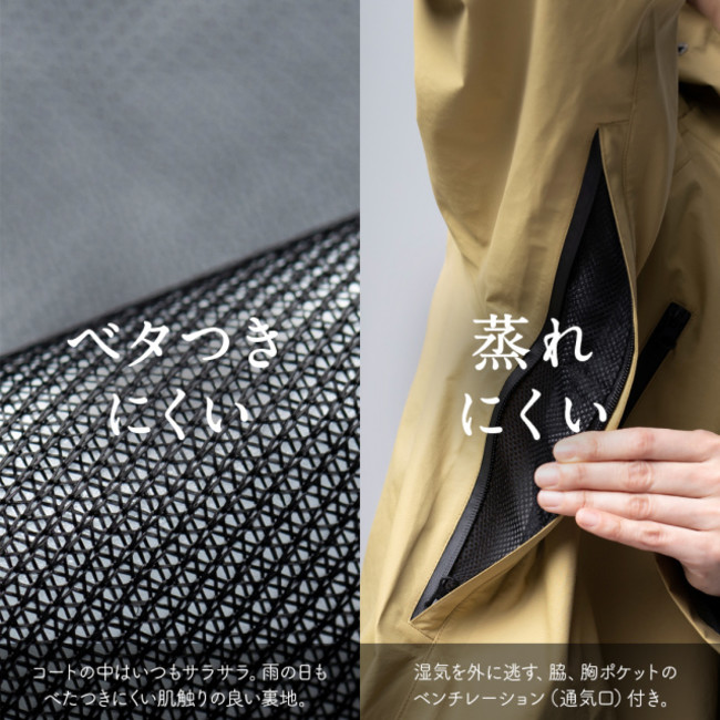高機能3層生地のサラサラ裏地で雨の日だって肌にべたつきにくい。