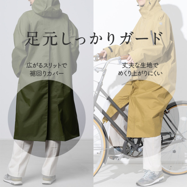 ロング丈の設計に加えて、後部のスリット形状により自転車に乗った際に裾が広がることで足元をカバーしてくれます。