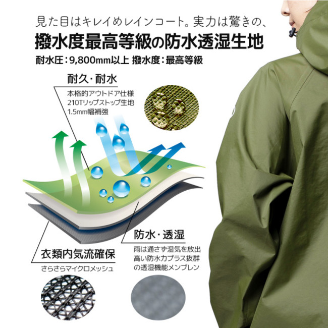 ・本格的アウトドアウェアの機能性を備えた高機能レインコートで、雨の日の移動を快適に